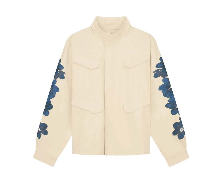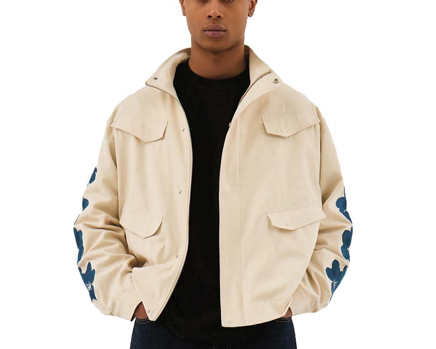 The cream flower-embroidered jacket offers a seasonal touch to a utility-style jacket. Crafted from premium cotton, this jacket features a relaxed fit and stand-up collar. It features four front pockets and a concealed zipper. The sleeves are embroidered with flowers.