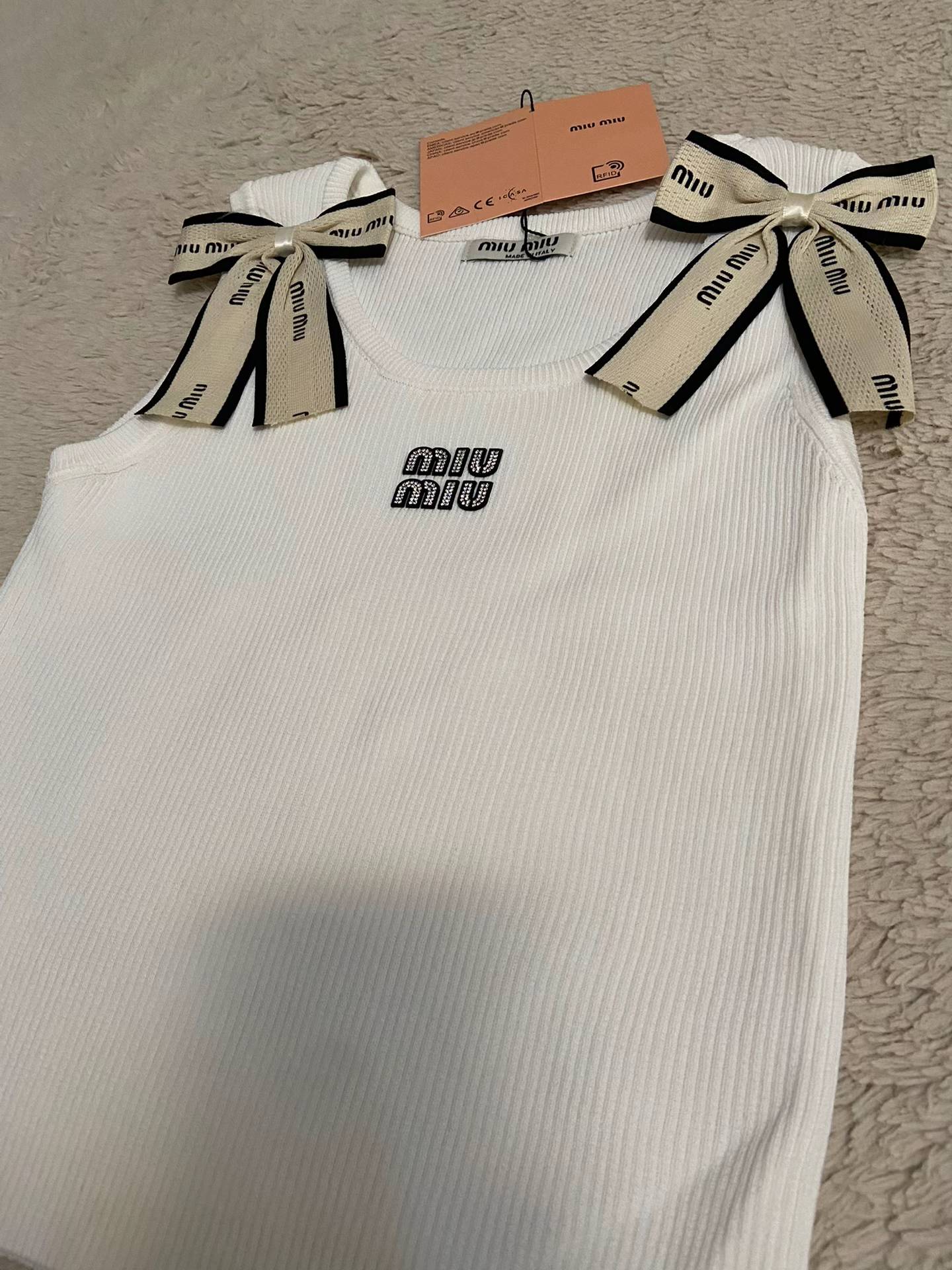 Débardeurs blancs Miu Miu avec p’tits nœuds bien visibles